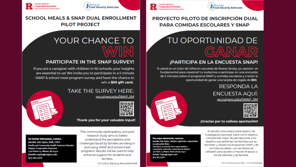 Good day, please see the following flyers regarding the Rutgers SNAP and School Meal Survey! Your insights are essential to us! We invite you to participate in a brief SNAP and Sc...